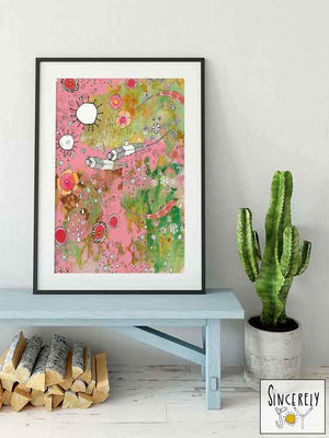 'Feathers, Flowers, Showers in pink' bohemian art poster print with matte finish.
